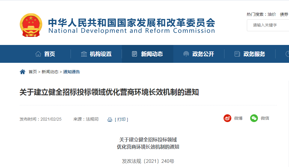 根據(jù)國務(wù)院部署要求,2019年以來,國家發(fā)展改革委聯(lián)合國務(wù)院有關(guān)部門在全國開展了工程項目招標投標領(lǐng)域營商環(huán)境專項整治,組織各地區(qū)、各有關(guān)部門對招標投標法規(guī)政策文件進行全面清理,廣泛征集損害營商環(huán)境問題線索,大力開展隨機抽查和重點核查,嚴肅查處破壞公平競爭的違法違規(guī)行為。通過專項整治,招標投標市場主體反映強烈的一大批突出問題得到有效解決,制度規(guī)則更加明晰,市場秩序不斷規(guī)范,不同所有制企業(yè)公平競爭的市場環(huán)境進一步形成。但應(yīng)當看到,與黨中央、國務(wù)院要求相比,與廣大市場主體期盼相比,招標投標領(lǐng)域營商環(huán)境仍存在薄弱環(huán)節(jié)。各地招標投標法規(guī)政策文件總量偏多,規(guī)則龐雜不一,加重市場主體的合規(guī)成本;地方保護、所有制歧視、擅自設(shè)立審核備案證明事項和辦理環(huán)節(jié)、違規(guī)干預(yù)市場主體自主權(quán)等問題仍時有發(fā)生,在一些市縣還比較突出;招標投標行政管理重事前審批核準備案、輕事中事后監(jiān)管,監(jiān)管主動性、全面性不足,一些行業(yè)領(lǐng)域監(jiān)管職責不清,對違法違規(guī)行為震懾不夠。為鞏固和深化招標投標領(lǐng)域營商環(huán)境專項整治成果,進一步營造公平競爭的市場環(huán)境,迫切要求建立健全長效機制,久久為功,持續(xù)發(fā)力,推動招標投標領(lǐng)域營商環(huán)境實現(xiàn)根本性好轉(zhuǎn)。