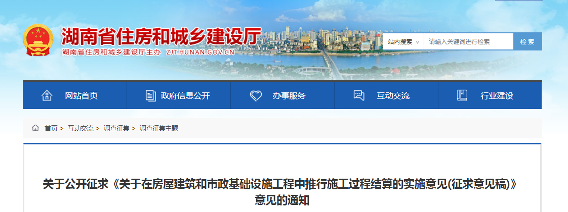 2020年5月28日,湖南省住建廳發布《關于在房屋建筑和市政基礎設施工程中推行施工過程結算的實施意見(征求意見稿)》,在省內房建、市政項目中全面推行施工過程結算。