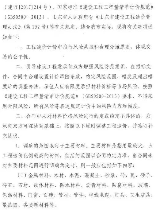 2018年1月30日,濟(jì)南市住建委印發(fā)《關(guān)于加強(qiáng)工程建設(shè)材料價(jià)格風(fēng)險(xiǎn)控制有關(guān)事項(xiàng)的通知》(濟(jì)建標(biāo)字〔2018〕2號),明確工程計(jì)價(jià)中應(yīng)推行風(fēng)險(xiǎn)共擔(dān)和合理分?jǐn)傇瓌t,承包人應(yīng)有限度承擔(dān)材料價(jià)格等市場風(fēng)險(xiǎn)。