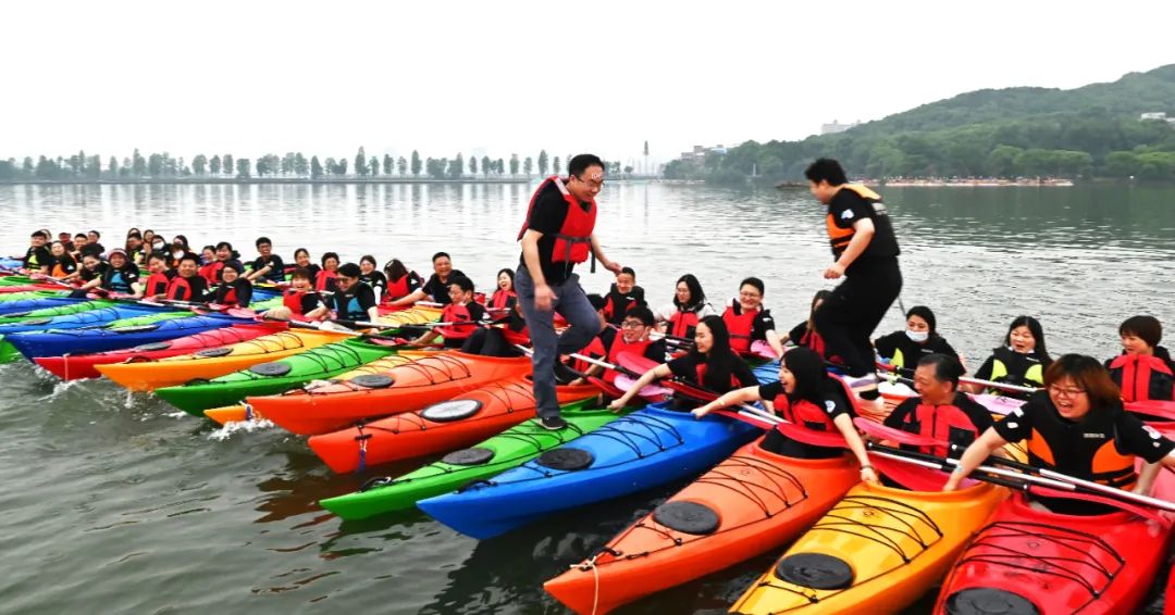 接下來是皮劃艇環節,五顏六色的皮劃艇整齊的排列在地上,小伙伴們早已迫不及待的穿上了救生衣,拿起了船槳,整齊的方陣蠢蠢欲動,頗有“百萬雄師過大江”的氣勢。