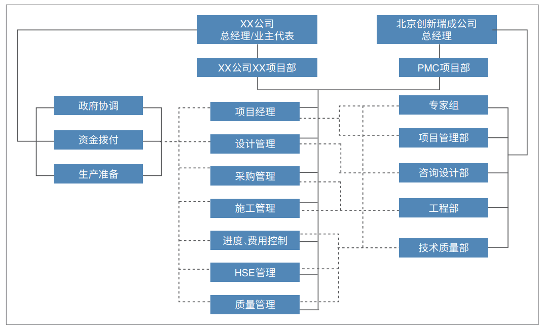 PMC的英文原意為項目管理承包/項目管理咨詢,在工程建設領域,PMC通常是指承擔工程項目管理承包/咨詢業務的項目管理公司,或是指業主對工程項目建設采取了項目管理承包/咨詢的模式。PMC作為一種工程項目建設組織管理模式,國際上最早出現于20世紀70年代中后期的中東地區,到20世紀90年代初,美國柏克德公司(BECHTEL)擔任“科威特戰后油田及煉油恢復項目”(簡稱“戰后修復工程”)的PMC承包商,這項巨型的國家戰后修復工程的完成,則是PMC作為一種工程項目管理模式成型的標志。此后,隨著PMC模式在世界各地工程建設中運用的增多,逐漸發展成為國際通行的工程建設項目管理模式之一。21世紀伊始,中國工程建設領域開始出現PMC模式。其早期標志主要有:2000年8月,投資約40億美元的南海石化項目發出PMC招標書。該項目業主(中國海洋石油公司和殼牌公司組建的合資公司)決定采用國際通行的PMC項目管理模式,由PMC承包商代表業主對工程建設全過程進行管理。這是中國首個采用PMC模式的工程項目。2003年3月,原建設部印發的《關于培育發展工程總承包和工程項目管理企業的指導意見》(建市[2003]30號)提出:“工程總承包和工程項目管理是國際通行的工程建設項目組織實施方式。積極推行工程總承包和工程項目管理……”這是我國首個給出“PMC”概念的部門規章。2004年1月,化學工業出版社出版《創建國際型項目管理公司和工程公司實用指南》,這是國內最早對PMC及項目管理公司進行完整描述的一本專著。近20年來,PMC模式被中海油、中石化、中石油、中國神華、中國中化等大型集團投資建設的一批大、中型項目所采用,取得了良好的工程建設效果,從而使PMC模式在我國工程建設領域得到了一定程度推廣。PMC模式是國際通行的現代工程建設項目管理模式,旨在規范、提升業主(建設單位)方的專業化工程項目管理水平。PMC模式是業主聘用專業化項目管理公司作為項目管理承包商代表業主或協助業主組織開展項目的工程建設活動,實施專業化、科學化的項目管理,以有效實現工程項目的各項建設目標。業主則以項目投資主體的身份,從建設目標、資金籌措、政府協調等整體上監督和控制整個項目,而不具體管理業主本身并非專長的一些項目管理內容。必要時,業主委托監理機構在PMC管理下對工程現場施工進行監理。IPMT(Integrated Project Management Team)是PMC的演變形式,中文意為“聯合項目管理組”,又稱“一體化項目管理團隊”,是指項目管理公司派出一批項目管理專業人員與業主的工程建設管理人員組成一體化項目管理團隊(IPMT),IPMT代表業主對項目建設全過程實施管理(圖1)。采用IPMT方式,一般是因為業主擁有一定的工程管理力量,但專業不全或不配套、項目管理體系不健全,業主通過引入項目管理公司,完善其項目管理體系,并對其有欠缺的專業管理進行“填平補齊”。