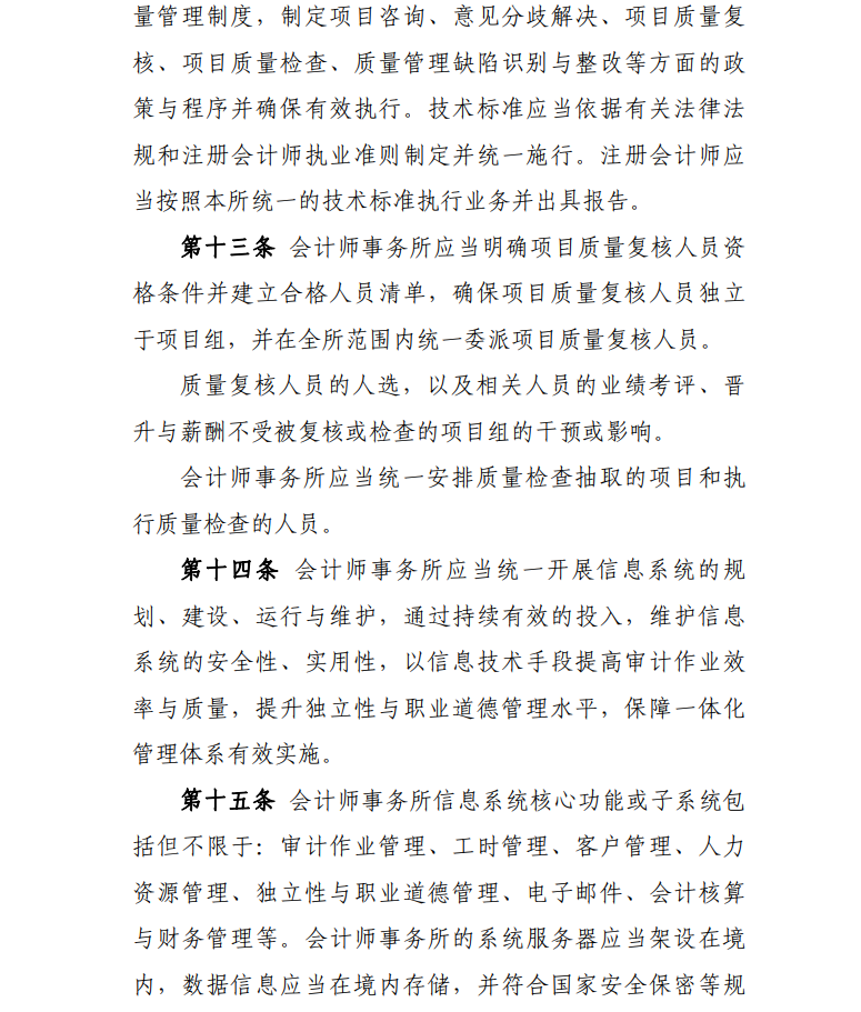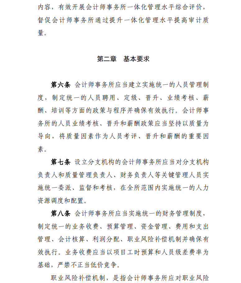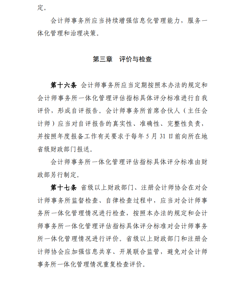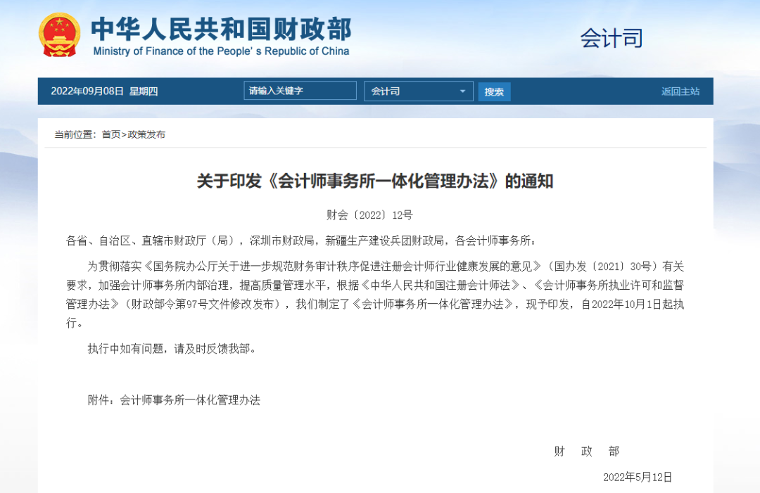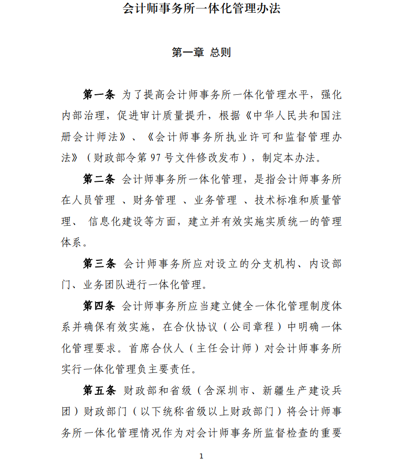 為貫徹落實《國務院辦公廳關于進一步規(guī)范財務審計秩序促進注冊會計師行業(yè)健康發(fā)展的意見》(國辦發(fā)〔2021〕30號)有關要求,加強會計師事務所內部治理,提高質量管理水平,根據(jù)《中華人民共和國注冊會計師法》、《會計師事務所執(zhí)業(yè)許可和監(jiān)督管理辦法》(財政部令第97號文件修改發(fā)布),我們制定了《會計師事務所一體化管理辦法》,現(xiàn)予印發(fā),自2022年10月1日起執(zhí)行。