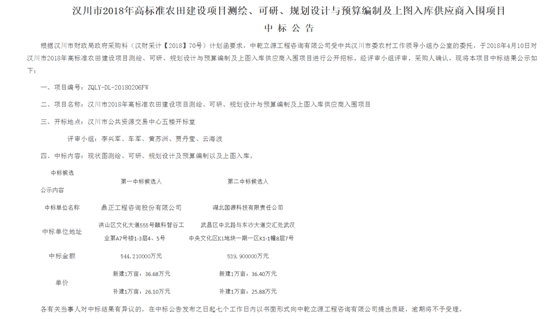 2018年4月11日,我司中標(biāo)“漢川市2018年高標(biāo)準(zhǔn)農(nóng)田項目”,該項目位于湖北省漢川市,項目規(guī)模約17萬畝,對漢川市2018年高標(biāo)準(zhǔn)農(nóng)田建設(shè)項目進(jìn)行測繪、可行性研究、規(guī)劃設(shè)計與預(yù)算編制,中標(biāo)金額為544.21萬元,中標(biāo)單價為新建1萬畝(36.68萬元)和補(bǔ)建一萬畝(26.10萬元)。