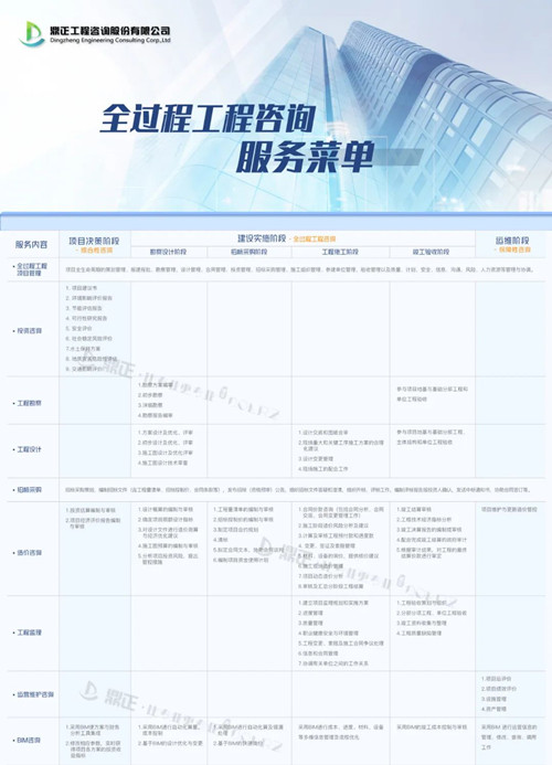 鼎正咨詢資質(zhì)資信及業(yè)務(wù)能力已覆蓋工程咨詢?nèi)a(chǎn)業(yè)鏈,可提供全過程工程咨詢、PPP全生命周期咨詢、項目策劃、工程投資咨詢 、土地利用規(guī)劃、城鄉(xiāng)規(guī)劃、工程設(shè)計、工程監(jiān)理、招標(biāo)代理、政府采購、工程造價咨詢、BIM咨詢等服務(wù)。