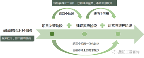 跨階段全過程程咨詢指提供跨兩個階段的服務(wù),能實現(xiàn)項目管理+2項以上專業(yè)咨詢服務(wù),容易獲得業(yè)主信任,獲得延伸服務(wù),市場前景較好。