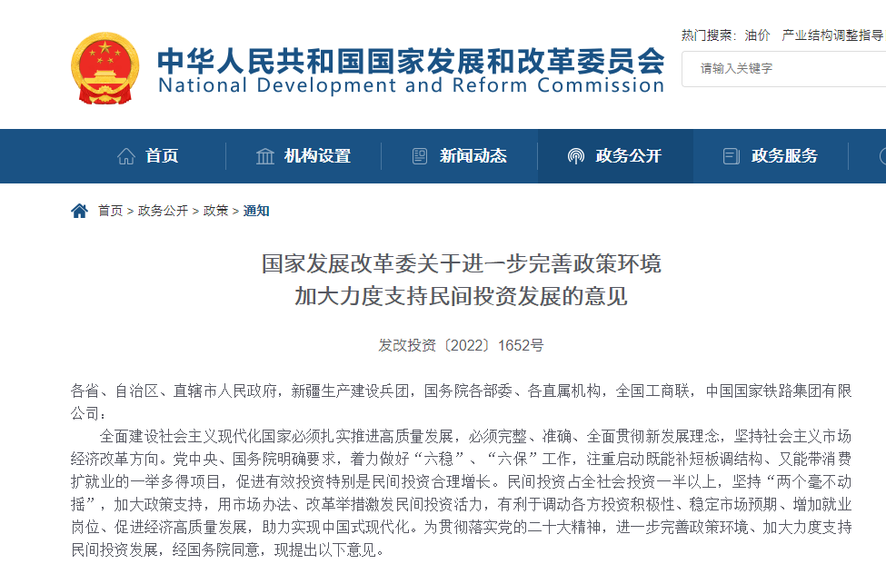 全面建設(shè)社會主義現(xiàn)代化國家必須扎實(shí)推進(jìn)高質(zhì)量發(fā)展,必須完整、準(zhǔn)確、全面貫徹新發(fā)展理念,堅(jiān)持社會主義市場經(jīng)濟(jì)改革方向。黨中央、國務(wù)院明確要求,著力做好“六穩(wěn)”、“六保”工作,注重啟動既能補(bǔ)短板調(diào)結(jié)構(gòu)、又能帶消費(fèi)擴(kuò)就業(yè)的一舉多得項(xiàng)目,促進(jìn)有效投資特別是民間投資合理增長。民間投資占全社會投資一半以上,堅(jiān)持“兩個(gè)毫不動搖”,加大政策支持,用市場辦法、改革舉措激發(fā)民間投資活力,有利于調(diào)動各方投資積極性、穩(wěn)定市場預(yù)期、增加就業(yè)崗位、促進(jìn)經(jīng)濟(jì)高質(zhì)量發(fā)展,助力實(shí)現(xiàn)中國式現(xiàn)代化。為貫徹落實(shí)黨的二十大精神,進(jìn)一步完善政策環(huán)境、加大力度支持民間投資發(fā)展,經(jīng)國務(wù)院同意,現(xiàn)提出以下意見。