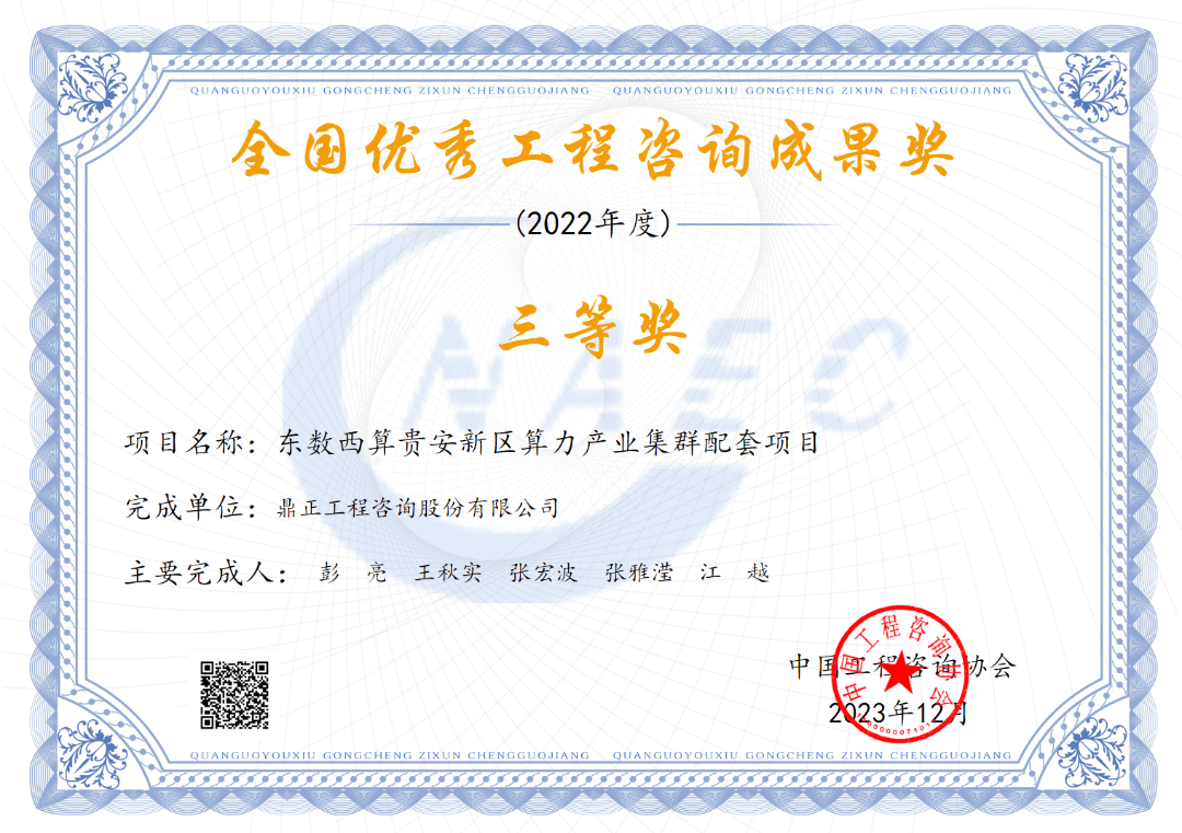 2023年12月29日,中國工程咨詢協(xié)會公布了“2022年度全國優(yōu)秀工程咨詢成果獎”獲獎項目名單,鼎正咨詢編制的《東數(shù)西算貴安新區(qū)算力立業(yè)集群配套項目》榮獲全國優(yōu)秀工程咨詢成果三等獎。