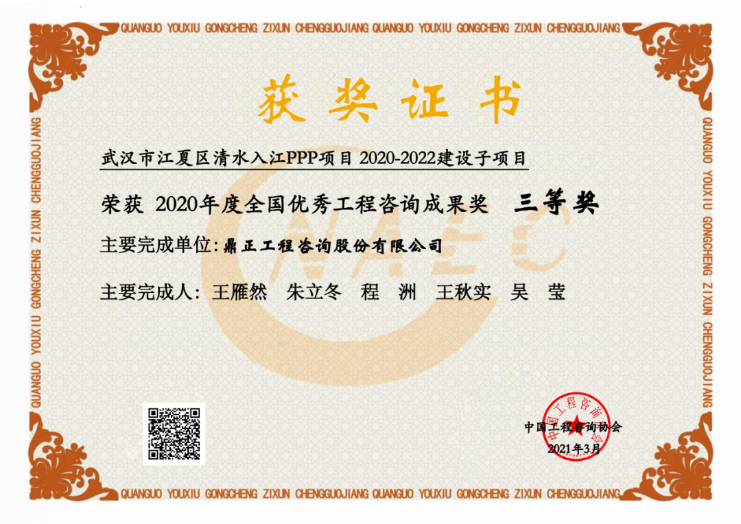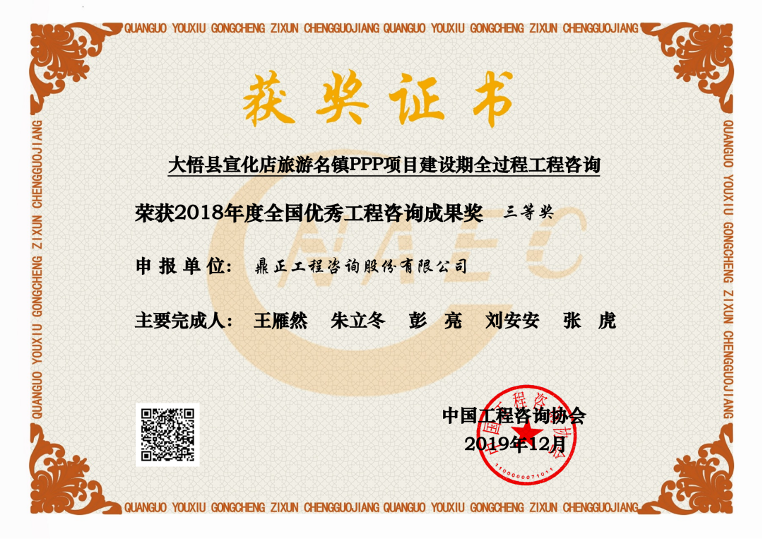 每兩年評選一次,2018-2019年,我司大悟縣宣化店旅游名鎮(zhèn)建設PPP項目首獲“全國優(yōu)秀工程咨詢成果獎”榮譽;2020-2021年,我司武漢市江夏區(qū)清水入江PPP項目再獲該獎;2022-2023年,我司東數(shù)西算貴安新區(qū)算力立業(yè)集群配套項目第三次獲得此殊榮。